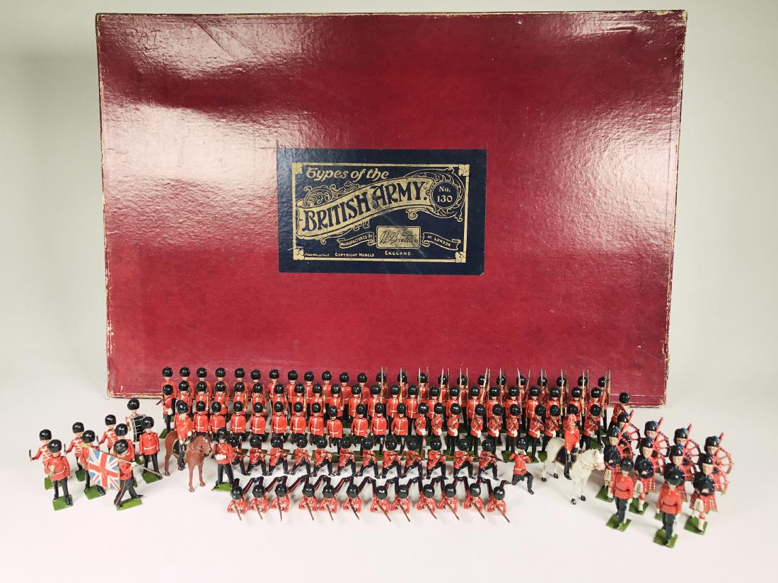 SoldBritains Set #130 Scots Guards DisplayPre-War. 116 pieces, in original wooden box. Untied. Flag bearer, two officers, mounted officer, field Marshall, standing, kneeling and lying firing, (legs together version), standing officer with binSee Sold Price