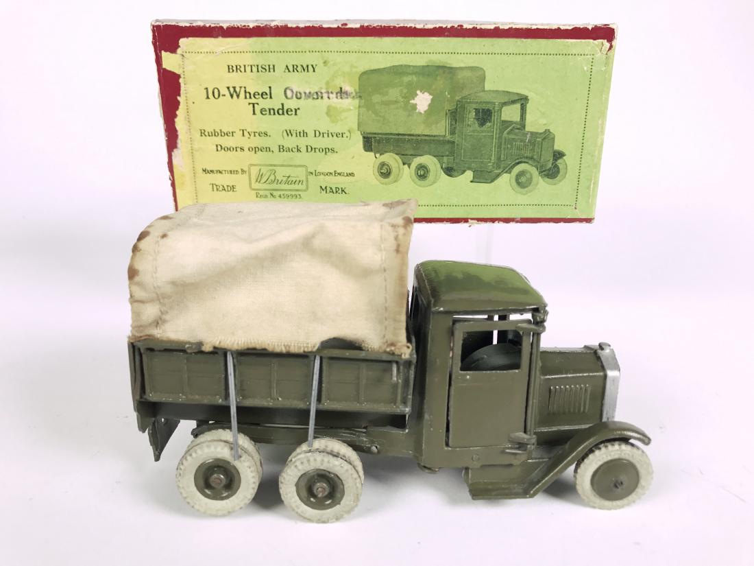 SoldBritains Army Lorrys & DriversBritains #1432 Army Covered 10 Wheel Lorry (1936 version), and Beetle Lorry #1877 (circa 1940). 4 pieces (including two drivers). Good condition (10 wheel lorry has a replacement tow hook, and BeetleSee Sold Price