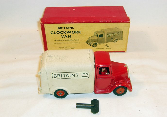 SoldBritains Set #2045 Civilian Clockwork Van.Boxed Clockwork van with driver & key to wind, blue cab with green van & red wheels. 3 pieces issued only 1950-1956. Condition near-mint in near-mint illustrated label box. Clockwork works well. ScarcSee Sold Price