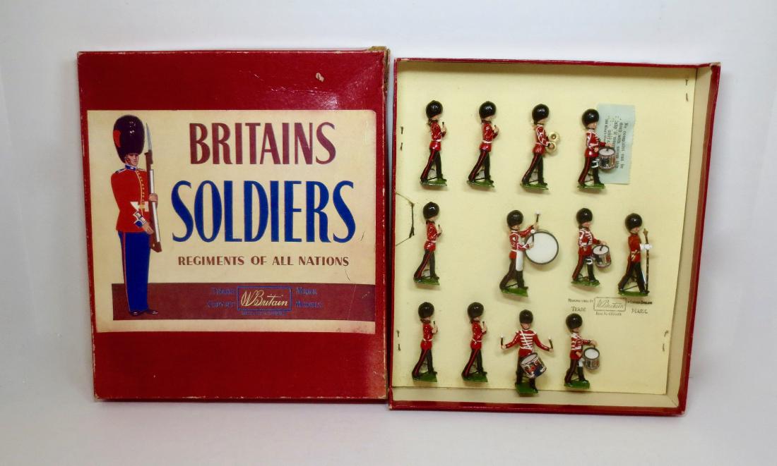 SoldBritains Set #2108 Band Of The Welsh Guards.Boxed Welsh Guards Band. 12 pieces, only offered 1956-1960. Condition excellent (drum decals chipping) tied in very good ROAN box, slight restoration to original lid.See Sold Price