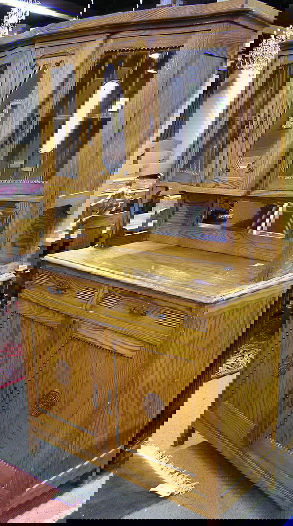 SoldLARGE TWO-PIECE FRENCH PINE HUTCH W/ GLASS DOORSFrench, late 19th century (5) keys included. Shelves adjustable. Brass fittings. Mid 20th century.Dimensions: H 84"x D W 82"x D 19.75".Condition: Separation to back panels. Discoloration to top due toSee Sold Price