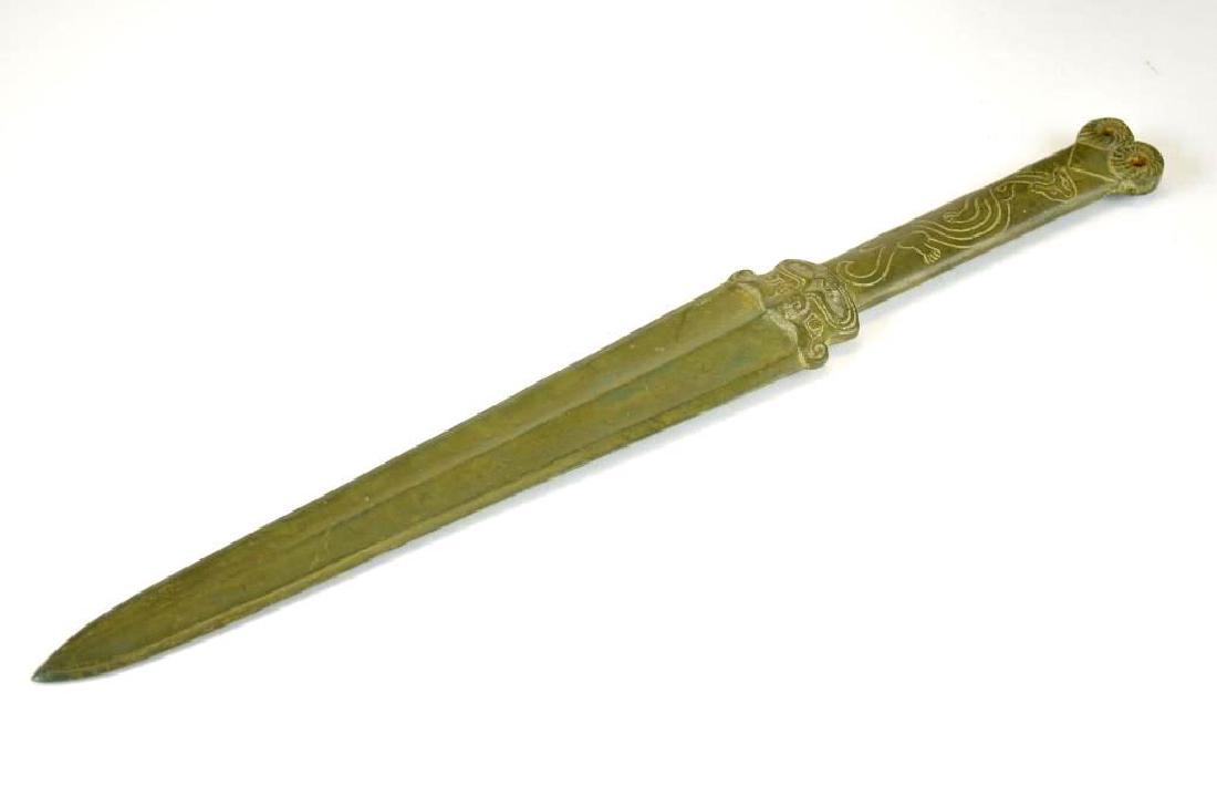 SoldChinese Bronze Weapon AssortmentChinese Bronze Weapon Assortment (3) archaic style items including a ge halberd blade head, jian dagger having jade / hardstone guard, handle and pommel and a Shang Dynasty-style double-edged curved rSee Sold Price