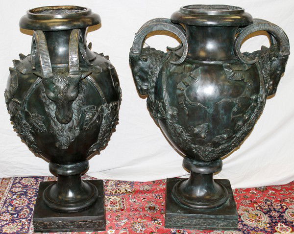 BRONZE DOUBLE RAM'S HEAD HANDLED VESSELS, PAIR