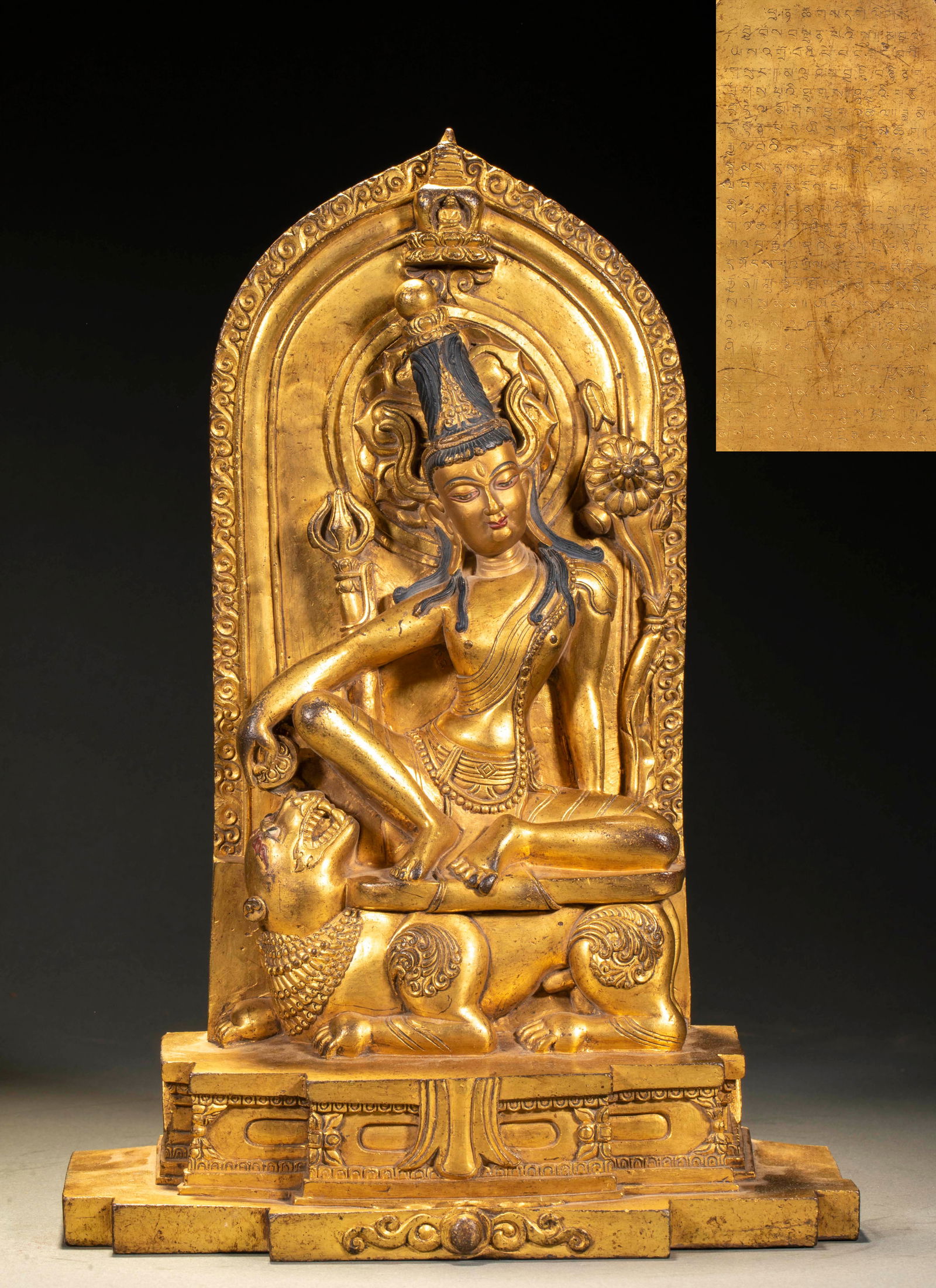 SoldChinese Gilt Gold Bronze Bodhisattva Manjusri Statue中國明代 鎏金青銅 文殊菩薩雕像Chinese Gilt Gold Bronze Buddhism Bodhisattva Manjusri StatueDimension: 230x140x315(mmSee Sold Price