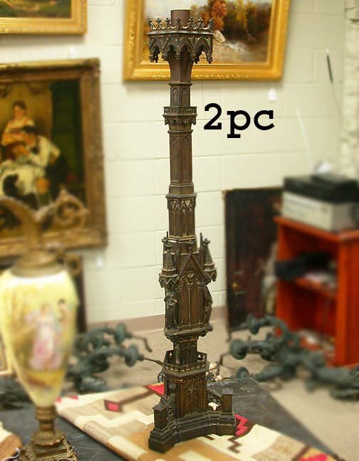 Pair of Large Gothic Style Spelter Altar Pricket Candlesticks, late 19th c., H.- 27 in., Dia.- 7 in.Pair of Large Gothic Style Spelter Altar Pricket Candlesticks, late 19th c., the circular candle cup on a tapered hexagonal support atop a pierced tripodal arched architectural windowed base, on a ste