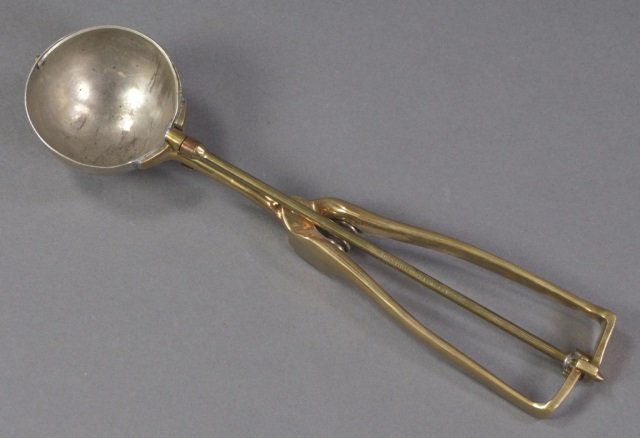 SoldEarly Unusual Thumb-Operated Ice Cream Scoop.When the thumb plunger is pressed, the ejector plate inside the bowl turns 180° and moves downward to eject ice cream. This scoop is not marked in any and the manufacture is unknown. Virtually no weaSee Sold Price