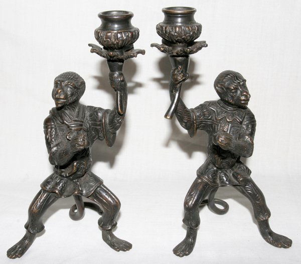 BRONZE MONKEY CANDLESTICKS, PAIR, H 8 1/2"