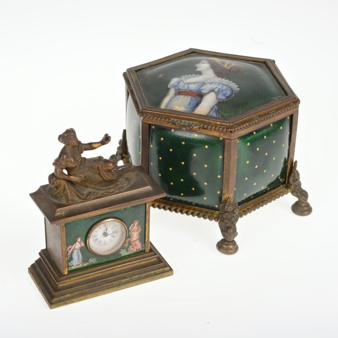Sold19th Century Bronze Mounted Green Onyx & Enamel on Copper Portrait Box19th Century French Bronze Mounted Green Onyx Box w/ an Enameled Portrait Plaque. Measures 5.25 inches x 4.5 inches x 2.75 inches high. Overall good condition, there is a crack in the onyx, please seeSee Sold Price