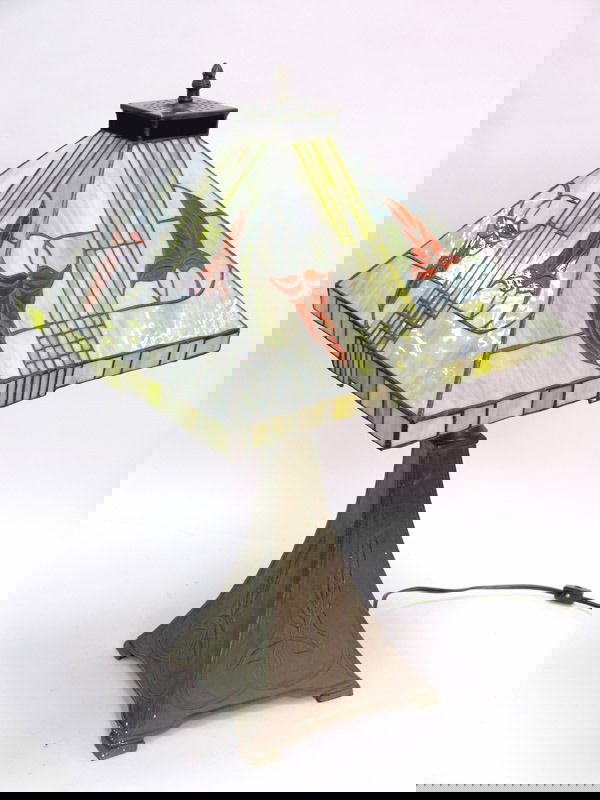 SoldFINE 39"PAINTED FIGURAL BRONZE STYLE ARTGLAS LAMPFINE 39"PAINTED FIGURAL BRONZE STYLE ARTGLASS LAMP Condition GOOD H 39 W 20 INSee Sold Price