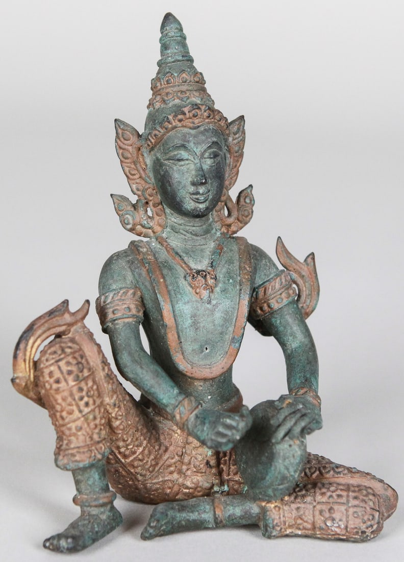 SoldAntique Phra Mae Thorani, Southeast Asian Earth Goddess Bronze Kneeling Deity StatueThis is a small antique bronze or brass statue depicting a kneeling figure, likely from Thailand or Cambodia, based on the intricate Southeast Asian styling and traditional attire. The figure is adornSee Sold Price