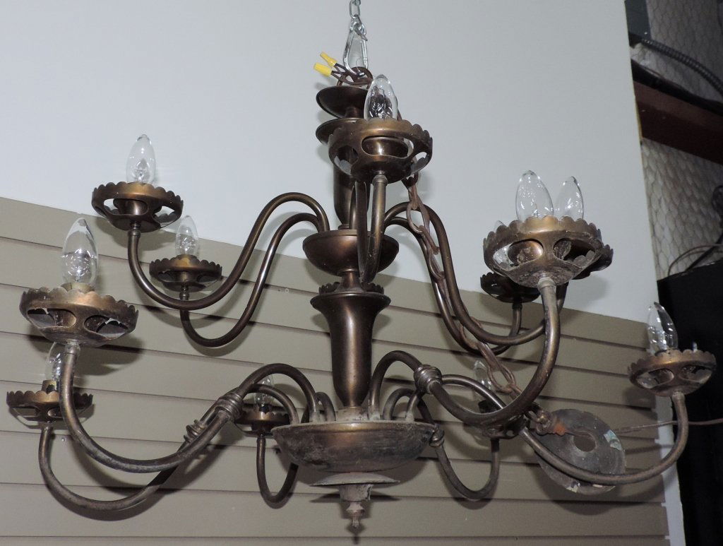 SoldBRONZE 12 ARM CHANDELIER CIRCA 1900BRONZE 12 ARM CHANDELIER, CIRCA 1900 H 34", DIA 29":Twelve lights arranged in two tiers, eight lights on lower tier and four lights on upper tier. Brown patina. For a high resolution photoSee Sold Price