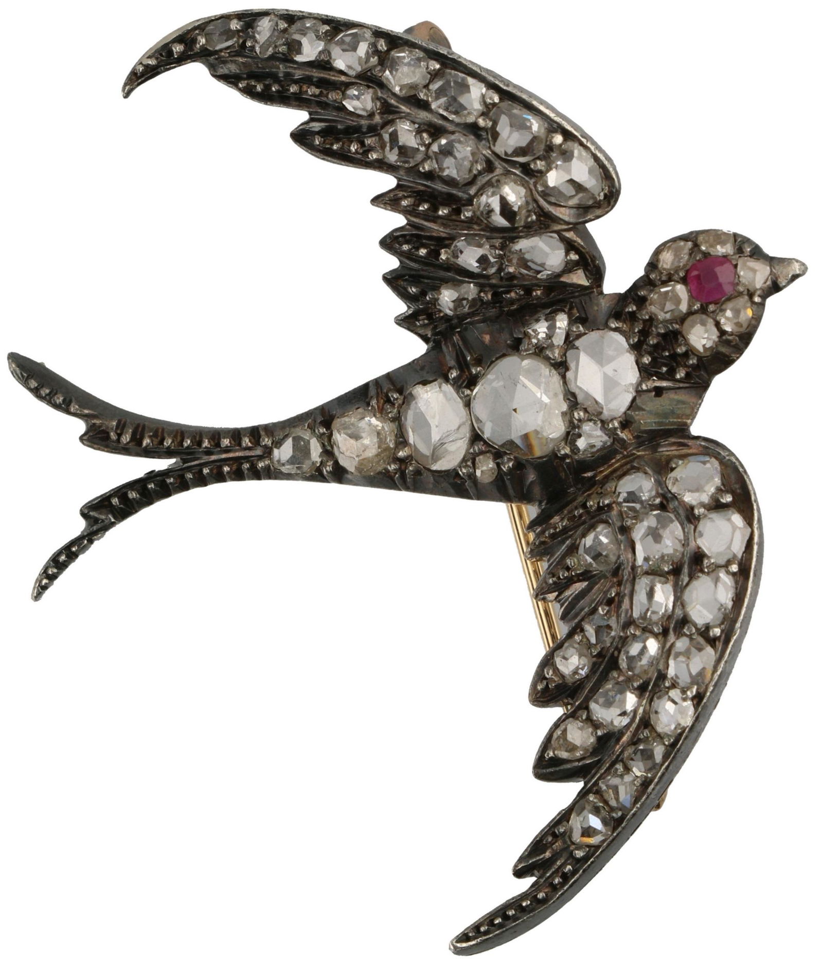 Brooch gold / silver, diamond and ruby - 18 ct. and