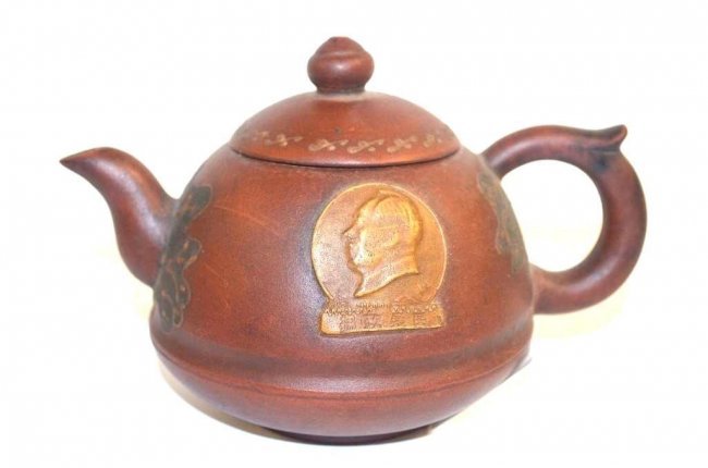 SoldTWO YIXING ZISHA TEAPOTSThe lot includes two Yixing Zisha teapots, both with globular form and brown clay, one teapot depicts lotus flowers, the other depicts Chairman Mao, marks on the bottom. Height 1: 4 in (10.2 cm) LengtSee Sold Price