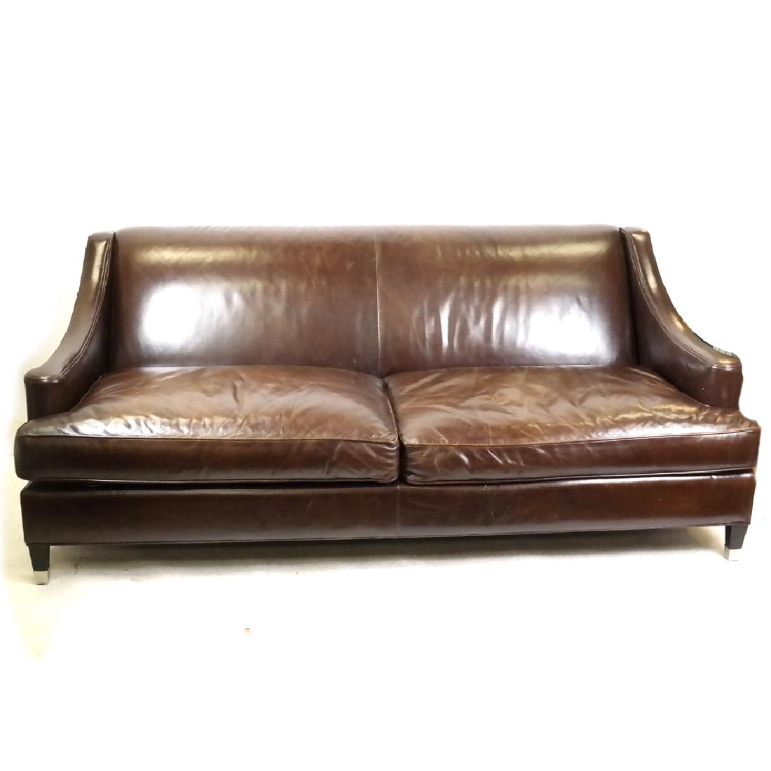 SoldRALPH LAUREN BROWN TWO SEAT LEATHER SOFARalph Lauren brown leather sofa, having a rounded back, arms, and two loose seat cushions, with manufacturer's label to the seat. Approximate dimensions: h. 33", w. 79", d. 41"; seat h. 24".See Sold Price