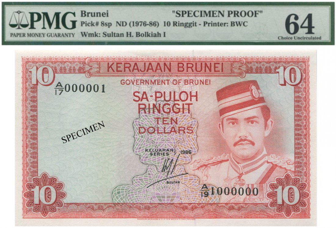 Brunei, 1986, 10 Ringgit Specimen, Pmg Unc 64