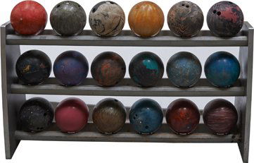 Brunswick Bowling Ball Rack w/18 Assorted Balls.