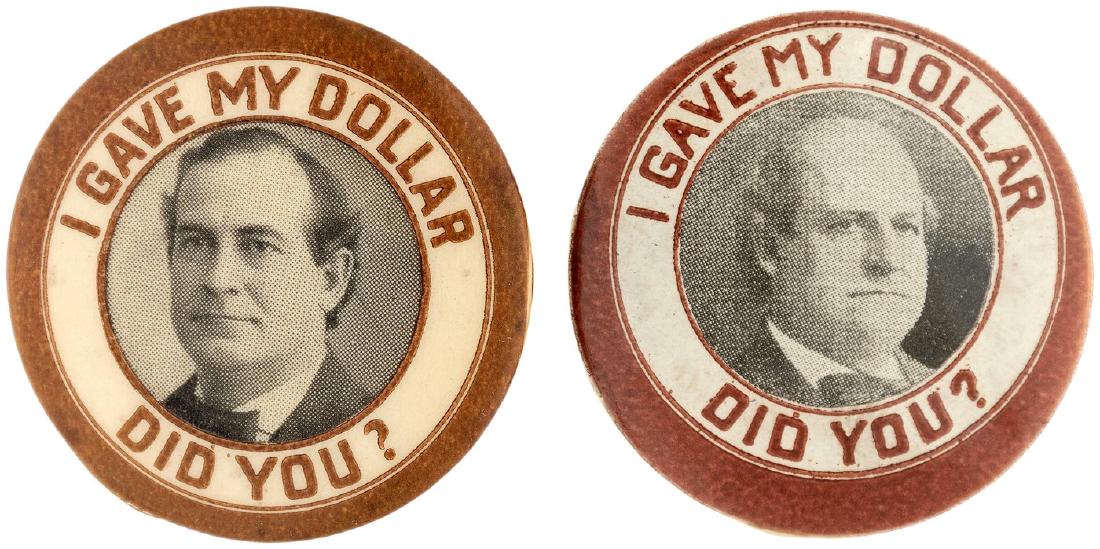 BRYAN "I GAVE MY DOLLAR" TWO DIFFERENT PORTRAIT BUTTONS