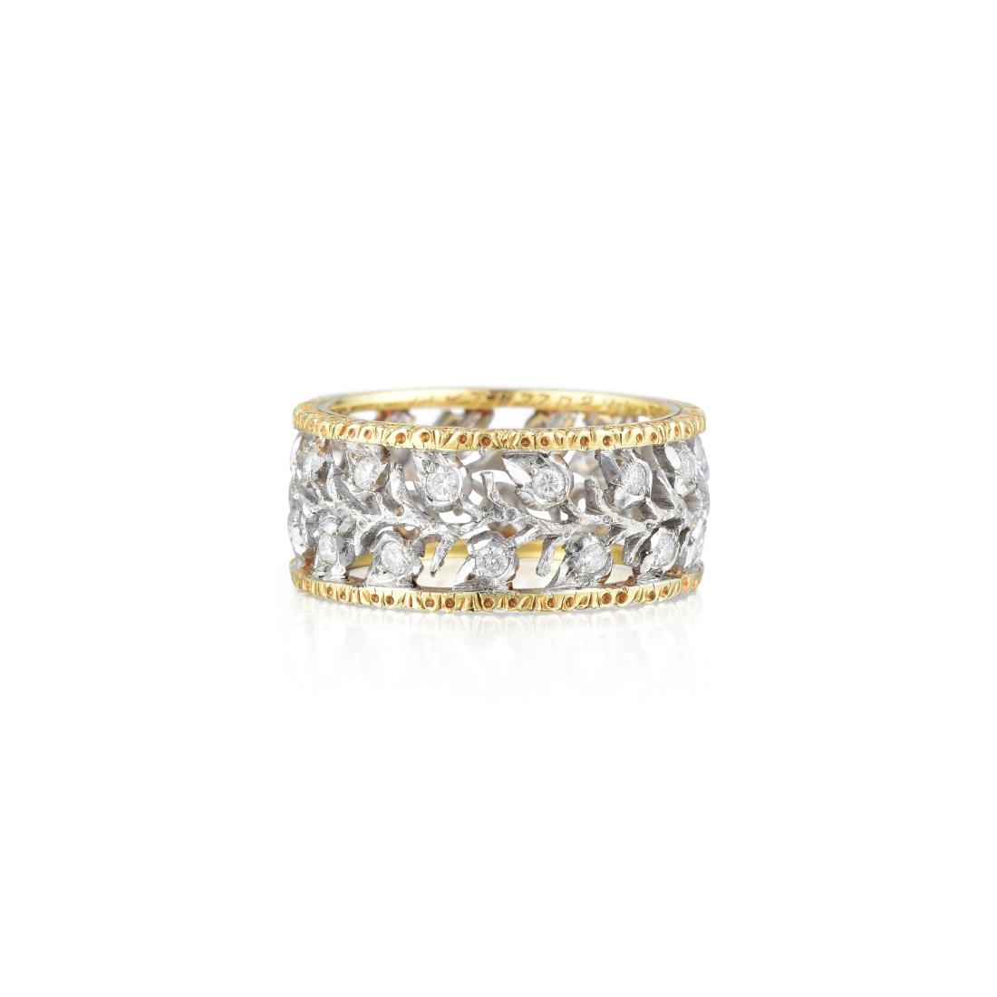 SoldBUCCELLATI ETERNELLE DIAMOND & 18K RINGBuccellati Eternelle diamond and 18k yellow and white gold ring, featuring (22) round brilliant cut diamonds weighing approximately 1.40cts total, of overall VVS clarity and E-F color, with inner siziSee Sold Price