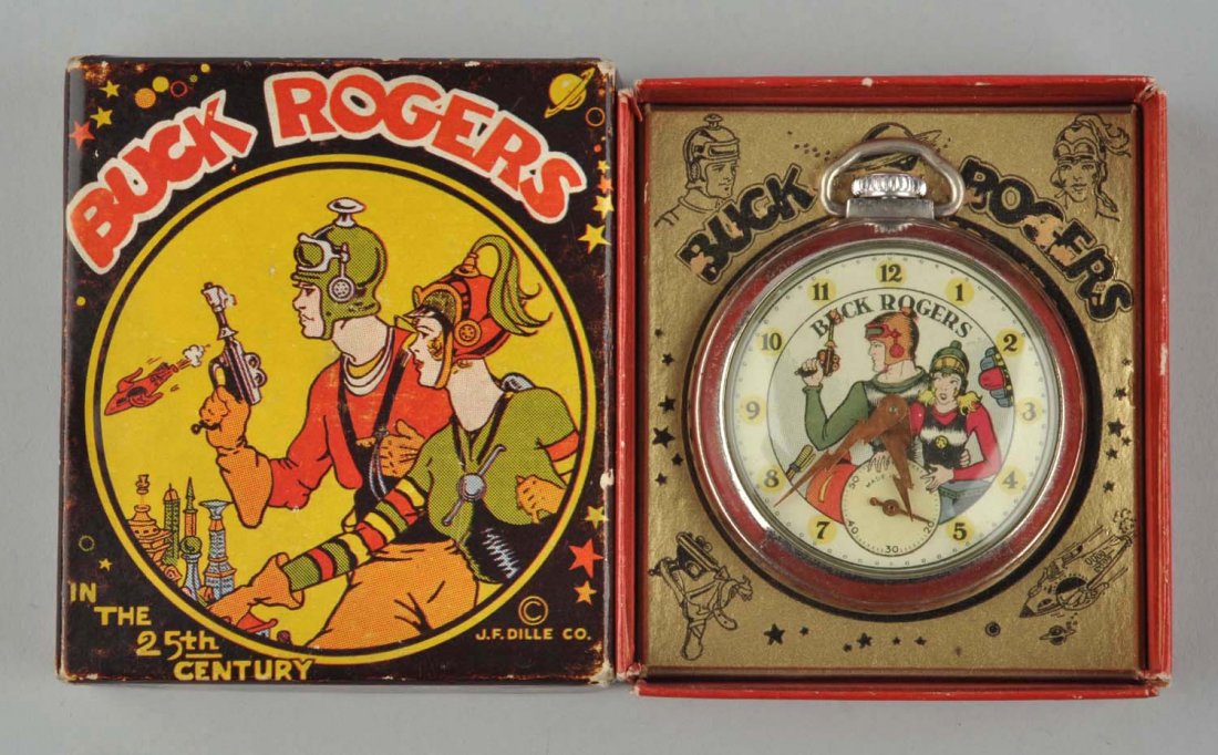 SoldBuck Rogers Pocket Watch. USA: Ingraham, ca. 1935. ABuck Rogers Pocket Watch. USA: Ingraham, ca. 1935. A Buck Rogers pocket watch depicting Buck and Wilma on the face. Slight scuff marks on verso; else working.See Sold Price