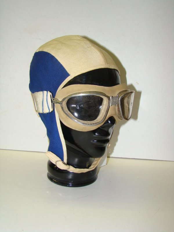 SoldAntique Aviator's Helmet and GogglesAntique Aviator's Helmet and Goggles. Oilcoth, metal, plastic. On stand. Size: 8'' x 7.5'' x 8'' (20 x 19 x 20 cm); Height on stand: 16'' (41 cm).See Sold Price
