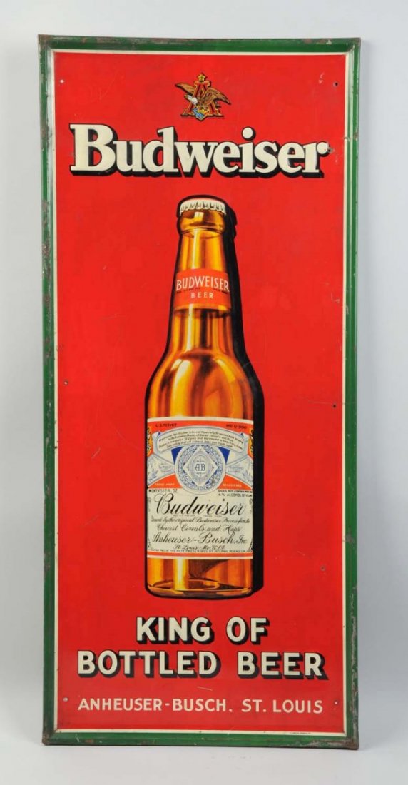 Budweiser Labeled Bottle Tin Litho Sign.