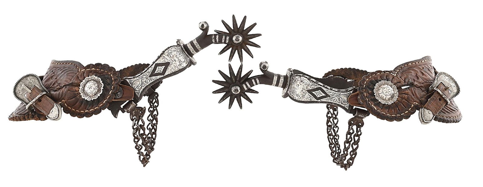 SoldTWO PAIRS OF AUGUST BUERMANN SPURS, AMERICAN, EARLY 20TH CENTURY,TWO PAIRS OF AUGUST BUERMANN SPURS, AMERICAN, EARLY 20TH CENTURY,one pair of silver mounted steel spurs with floral conchos and basket stamped brown leather straps, spurs stamped near buttons, "hand fSee Sold Price