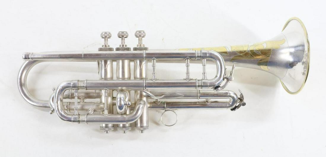 SoldSilvered trumpet with mouth piece, Vincent BachSilvered trumpet, engraved “The Buescher, Elkhart Indiana,” serial number LP 112276, with mouth piece stamped Vincent Bach, with case, 21.75"L.See Sold Price
