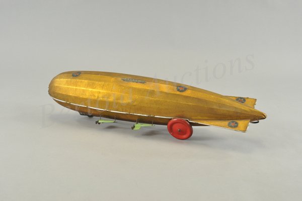 SoldBUFFALO TOYS LOS ANGELES ZEPPELIN159. BUFFALO TOYS LOS ANGELES ZEPPELIN | Celluloid propellers primarily missing, pull spring mechanism is functioning but could used adjustment to function better. | 25" l.See Sold Price
