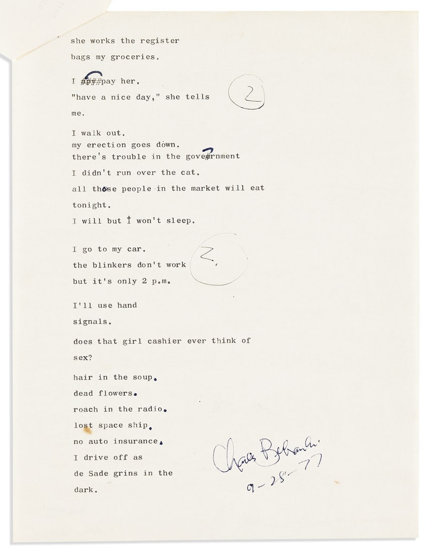 BUKOWSKI, CHARLES. Typescript dated and Signed, poem