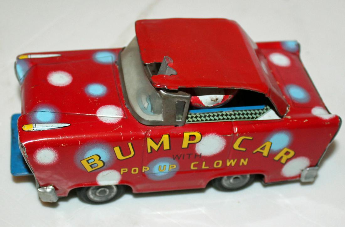 SoldJAPAN CRITERION TIN LITHO FRICTION BUMP CAR W/ POP-UP6.75" long tin litho car w/polka dot design and "Bump Car With Pop Up Clown" text on doors. Figure inside has tin litho collar and head (very Bozo-like) w/cloth body and rubber hands. Made in Japan bySee Sold Price
