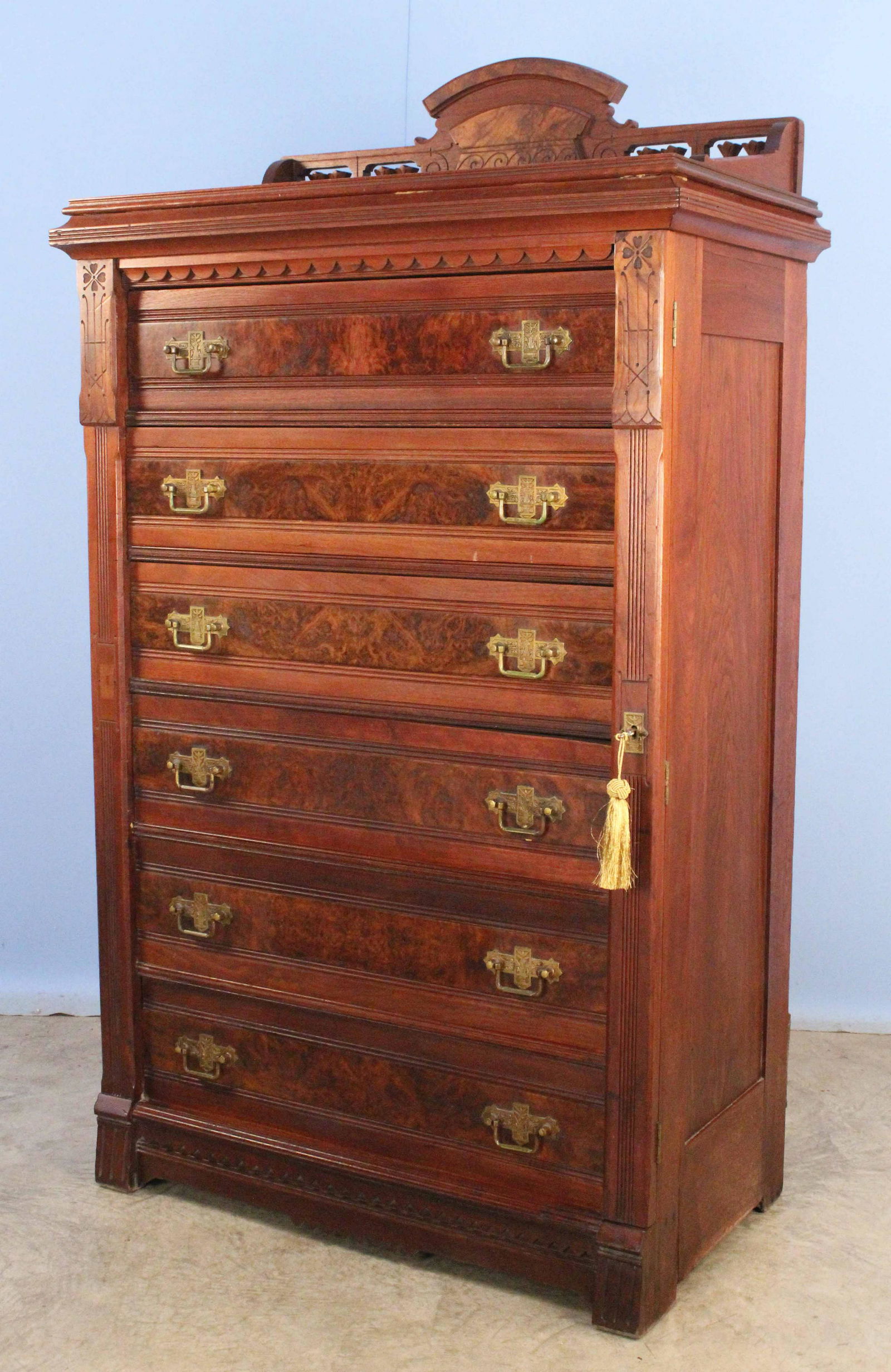 Burl Walnut Lock Side Six-Drawer Chest