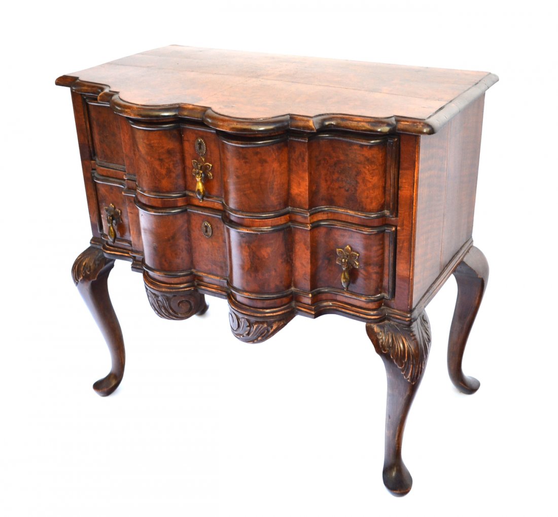 SoldFIVE DRAWER BURLED WALNUT CHESTGeorge III style dresser. Serpentine front with moulded rim, canted corners and ogee feet. Brass handles. 20th c. H. 37 1/2" W. 30 1/4" D. 18 1/4" Provenance: From Chelster Hall Oakville, Ontario by oSee Sold Price
