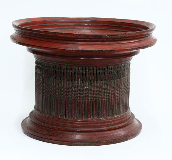 SoldBurmese Lacqered Offering VesselDESCRIPTION: A red lacquered Burmese lidded offering vessel embellished along the body with texturized incision patterns, completed with a raised finial. CIRCA: Late 19th Cent. ORIGIN: Burma DIMENSIONSee Sold Price