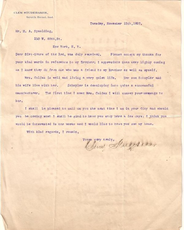 (BUSINESS.) STUDEBAKER, CLEMENT. Typed Letter