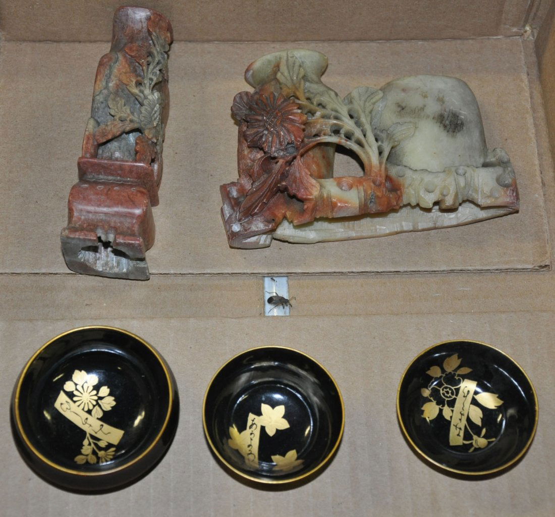 Bx - Two Small Soapstone Sculptures & Lacquerware Sauce