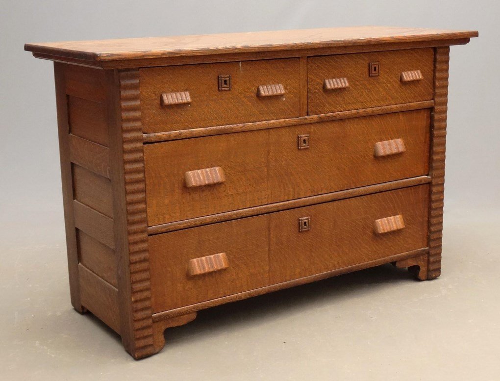 SoldANTIQUE AMERICAN OAK CHEST OF DRAWERSAmerican oak chest of drawers, c. 1900, plank serpentine top, over two aligned small drawers and two long drawers, moving on casters, visible seams at planks, approx 32"h, 42.75"w, 20.5"d Start Price:See Sold Price