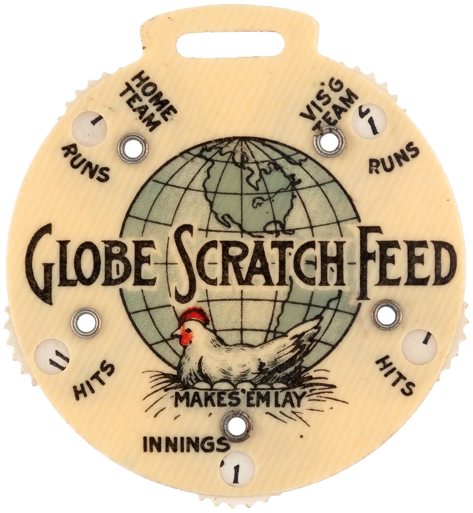 C. 1910s "GLOBE SCRATCH FEED" CELLULOID FOB BASEBALL