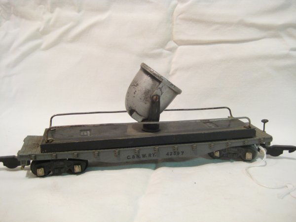 Sold7 Assorted Marx Freight CarsIncludes a 5590 Crane with searchlight; 4571 & 5561 Searchlight cars; late double searchlight, k/c; Late floodlight car with plastic housing; Barrel Car, complete; scarce FGE boxcar. All are dusty, buSee Sold Price