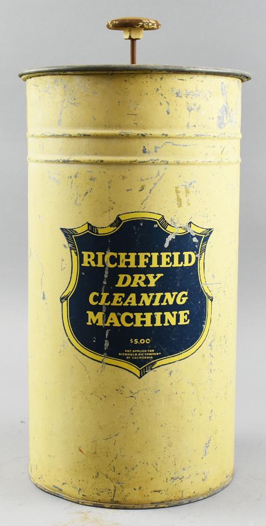 Soldc1940 Richfield Oil Corp $5 Dry Cleaning MachineThis fantastic piece is an original Dry Cleaning Machine by Richfield Oil Corporation. It was $5 when new and appears to be complete with instruction label in tact. Use of Klenzine indicates this piecSee Sold Price