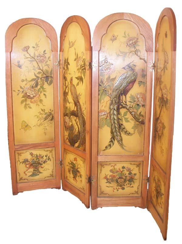 Ca.1900 paint decorated 4 part screen w/ peacocks