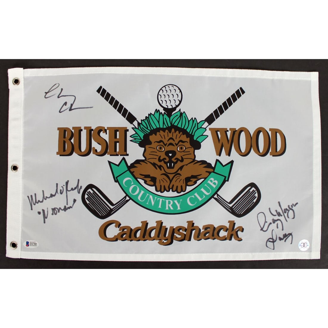 Caddyshack (3) Chase, Morgan & O'Keefe Signed Bushwood Flag BAS Witnessed BLACK FRIDAY