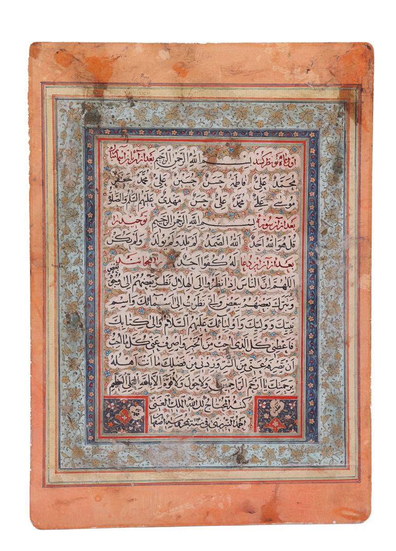 AN ILLUMINATED CALLIGRAPHER’S DIPLOMA (IJAZEH) ABDUL QADIR AL-SHUKRI, DATED 1821AH3 days LeftA QURAN SECTION (PART XVI) SURAH MARYAM, WRITTEN BY TURHAN IBN AHMAD, DATED 1153AH/1740AD, ST PETERS3 days LeftA CALLIGRAPHER'S DIPLOMA (IJAZA') IN THE FORM OF A HILYE, WRITTEN BY KHALIL AL-WAHBI, A STUDENT OF P3 days LeftTWO ILLUMINATED QURAN PAGES, INDIA SULTANATE, 15TH-16TH CENTURY3 days LeftA QURAN SECTION, CENTRAL ASIA DATED 1311 AH/1893 AD3 days LeftA LARGE QURAN LEAF IN MUHAQQAQ SCRIPT, CENTRAL ASIA OR ANATOLIA, 14TH CENTURY3 days LeftA CALLIGRAPHIC PANEL, SIGNED ISMA'IL JALAYIR, PERSIA 20TH CENTURY3 days LeftA LARGE QURAN FOLIO IN MUHAQQAQ SCRIPT, PERSIA 14TH CENTURY3 days LeftA LARGE QURAN FOLIO IN MUHAQQAQ SCRIPT, PERSIA 14TH CENTURY3 days LeftA MAMLUK QURAN PAGE, NEAR EAST, 14TH CENTURY3 days LeftA QURAN LEAF IN MAGHRIBI SCRIPT ON VELLUM, ANDALUSIA OR NORTH AFRICA 13TH CENTURY3 days LeftA QURAN LEAF IN MAGHRIBI SCRIPT ON VELLUM, ANDALUSIA OR NORTH AFRICA, 13TH CENTURY3 days LeftA QURAN LEAF IN MAGHRIBI SCRIPT ON VELLUM, ANDALUSIA OR NORTH AFRICA, 13TH CENTURY3 days LeftA CALLIGRAPHIC PANEL, PERSIA 20TH CENTURY3 days LeftCalligraphy Panel by Abd o Aghal Agah Jan PourDated 1282 AH / 1865–66 AD,3 days LeftA CALLIGRAPHIC ALBUM PAGE, SAFAVID PERSIA, 16TH CENTURY3 days Left