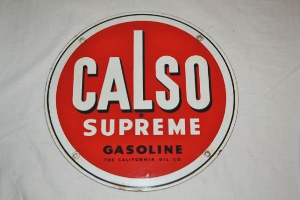 SoldCALSO SUPREME GASOLINE PORCELAIN PUMP PLATE SIGN.SSP. Sign is Maker Marked McAx. C. 1950's Porcelain Pump Sign for Calso Supreme Gasoline showing red, white & blue colors with Chevron graphic. CONDITION: Sign is overall fair showing a clean field shSee Sold Price