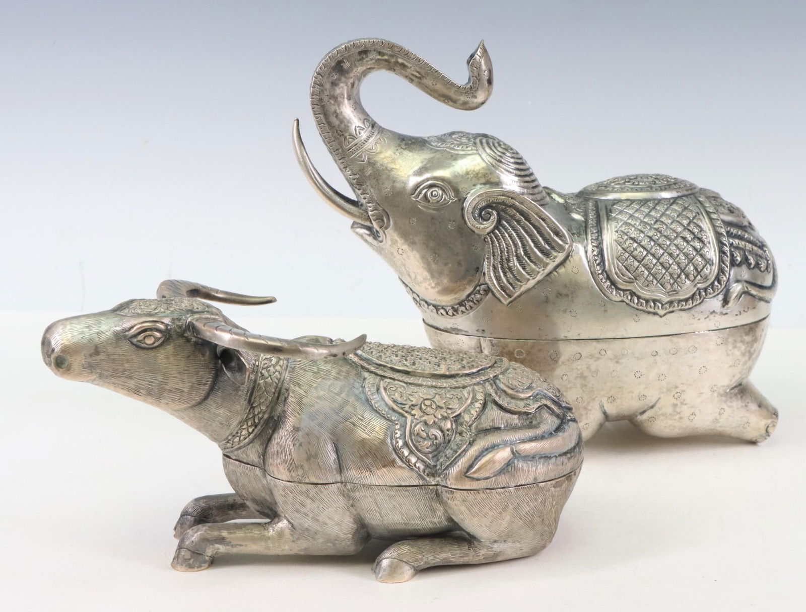 SoldCambodian Silver Betelnut BoxesAnimal form boxes with repousse decoration, including a stag and a foo dog marked T90%, a bull marked 99%, and an elephant marked IN. Mid 20th C. Sizes range from 2.25"h x 1.5"w x 3.5"d to 6"h x 3"w xSee Sold Price