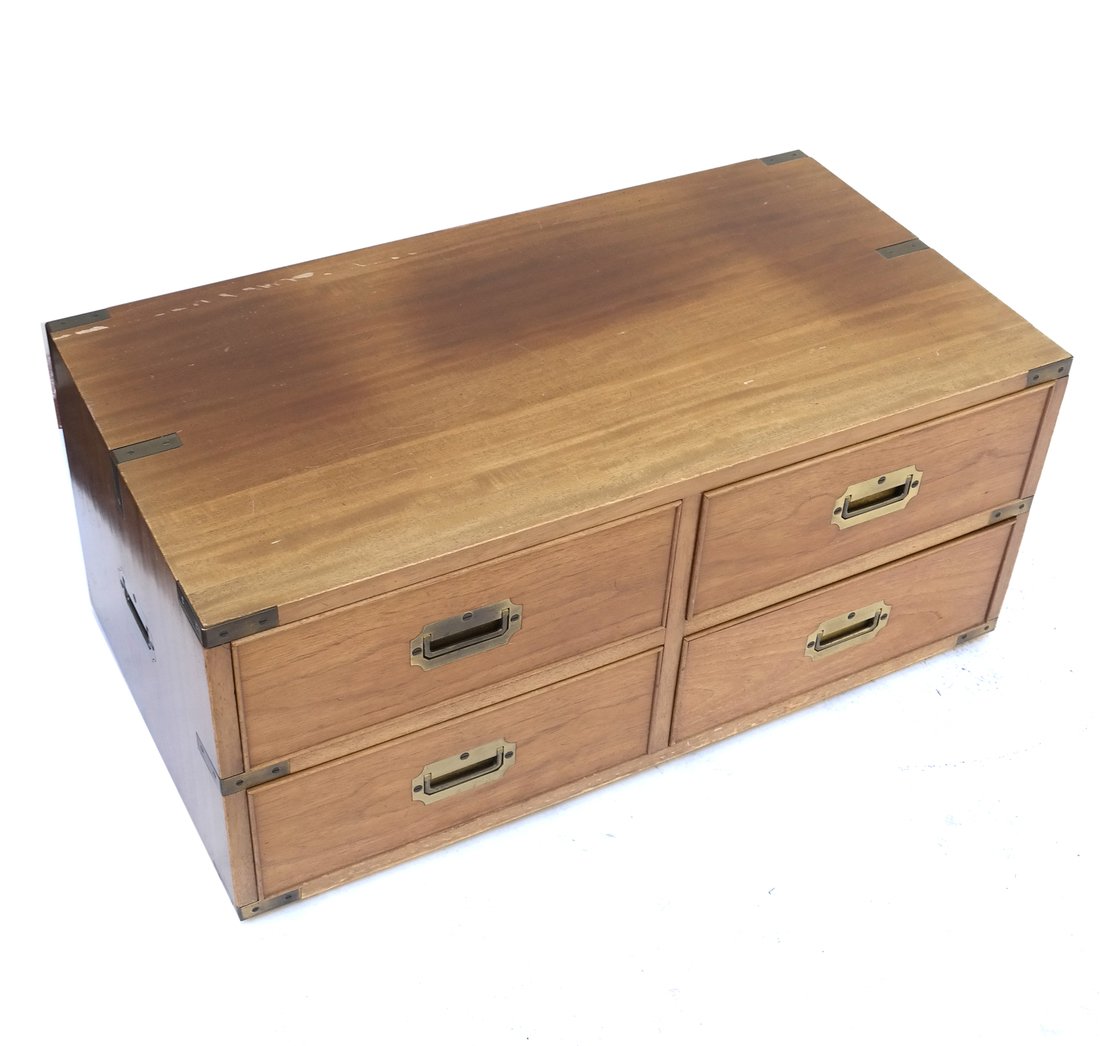 SoldCAMPAIGN STYLE CHEST OF DRAWERSNo key. Dimensions: H 37" x W 42" x D 20.75" Condition: Wear consistent with age and use including surface scratches, watermarks, nicks and dings. Side handles are slightly loose. Loss to right back cSee Sold Price