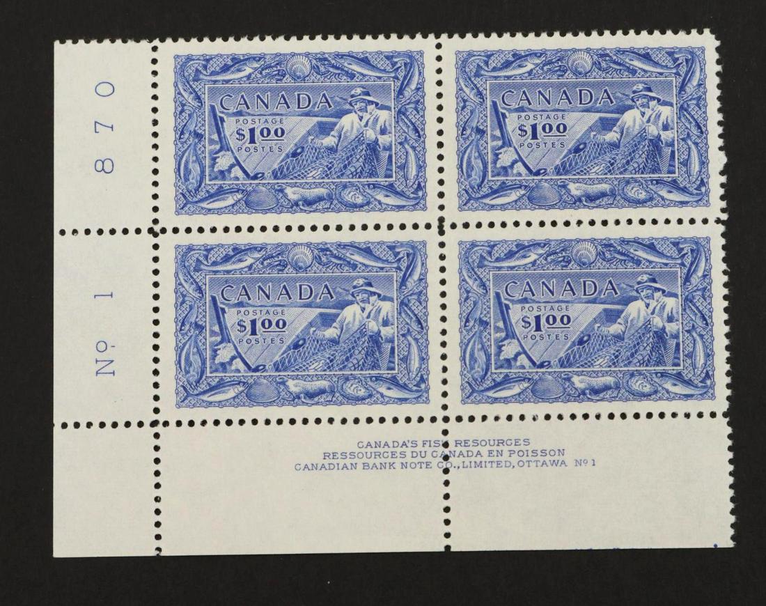 SoldCanada 1951 #302 block of 6 stamps VF **.Canada 1951 #302 block of 6 stamps VF **. Description: Fishing Resources issue, 1$ bright ultramarine. Corner block of 6 stamps mint never hinged. Unitrade 2021 catalog $360.00. Condition report: UponSee Sold Price
