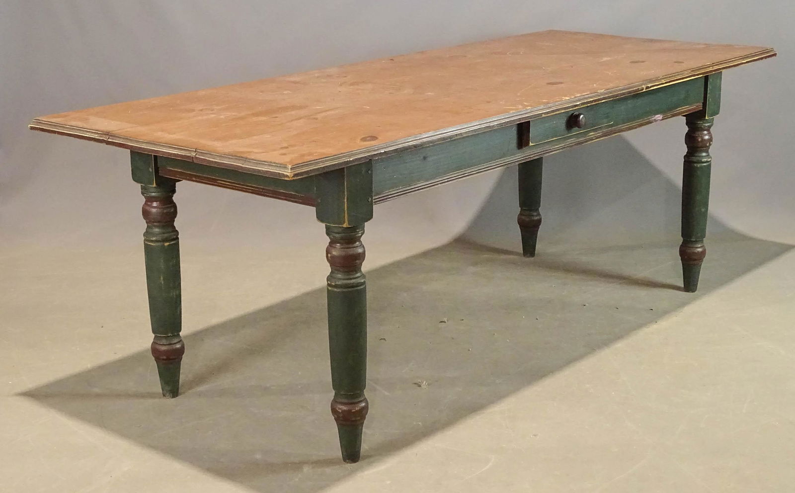 SoldCanadian Farm TableCanadian turned leg farm table in green paint with removable end leaves. 38" x 72", 30" Ht., 16" leaves.See Sold Price