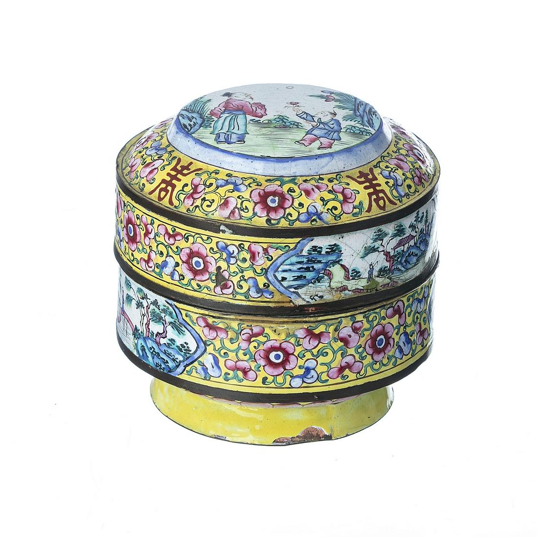 SoldA Pair of Chinese Canton Enamel BoxesPair of layered round enamel boxes decorated with scenes of garden and court children, ladies. Loss of enamels. 19th century. D: 4 inchesSee Sold Price