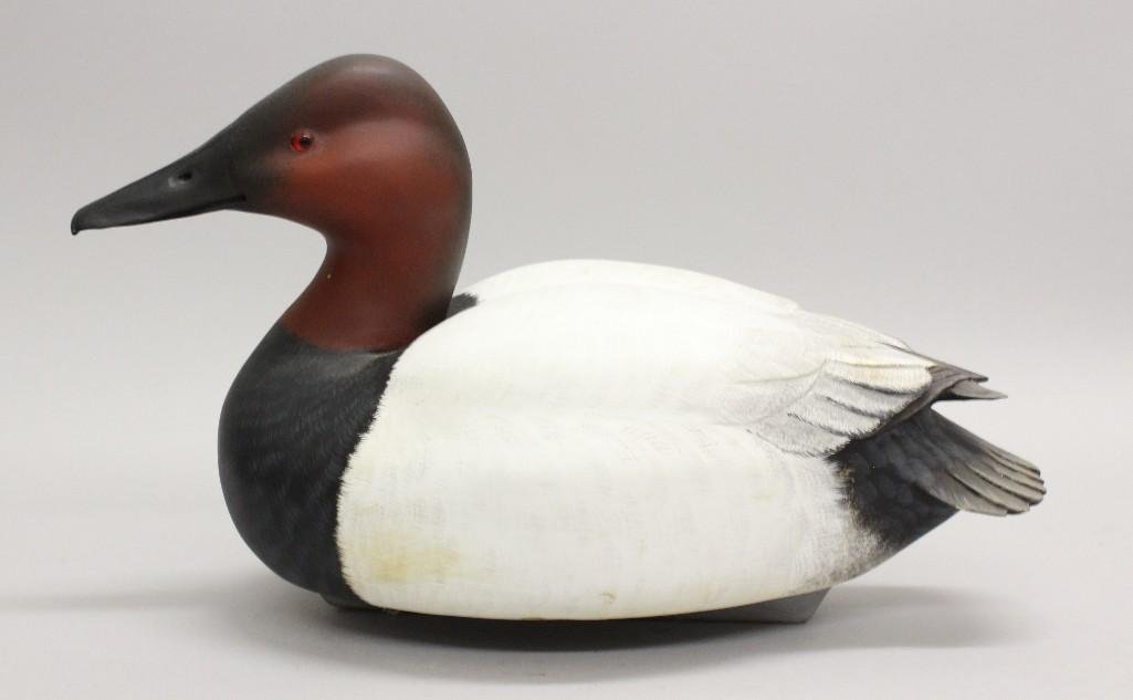 SoldJohn Zachmann Canvasback Drake Duck DecoyDetroit, MI, glass eyes, solid body, excellent original paint, nice feather carving on back & tail, makers brand signed & dated 2001 on bottom, 15"L, est. 500 - 800See Sold Price