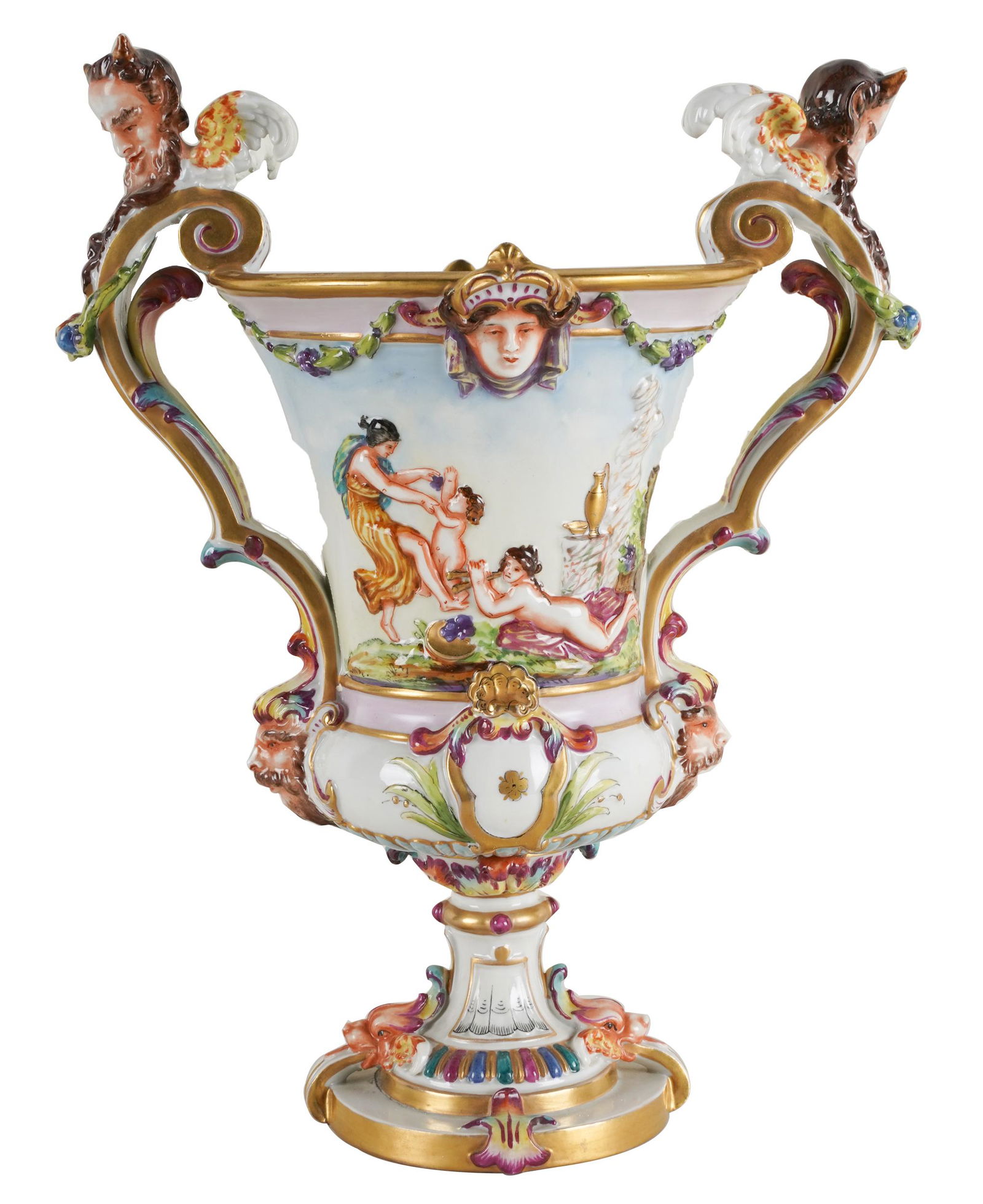 SoldCAPO DI MONTE PORCELAIN URNmarked to underside; Provenance: The Estate of Henry and Lillian Mosauer; Provenance: The Estate of Henry and Lillian Mosauer; 8 1/2 inches wide; 6 inches deep; 10 3/4 inches highSee Sold Price